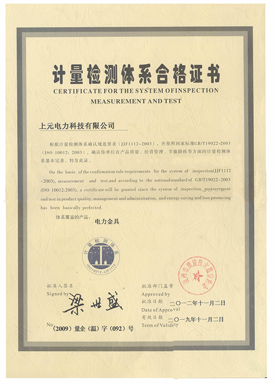 CERTIFICATE FOR THE SYSTEM OFINSPECTION MEASUREMENT AND TEST |
