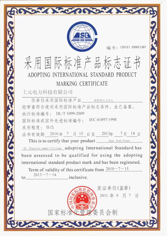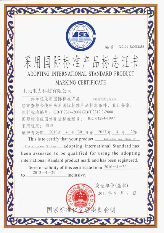 9月28日,市质量技术监局举行了“国际采标标志证书颁发仪式”,为我公司在内的30家企业的89个产品现场发放采标标志证书。我市10个行业的63家企业代表人员参加仪式。为企业免费服务、批量办理、现场颁证、发放采标标志证书,在整个温州地区乃至浙江省尚属首创。 仪式上,市质量技术监督局相关领导和专家就采标的意义和目的作了详细的讲解,同时介绍了采标确认和采标标志办理、使用等具体事项。在仪式中,市质量技术监督局领导亲自为我公司颁发了铝铜铝类、可锻铸铁类、铸铁类、锻压类电力金具采用国际标准产品标志证书,这标志着公司产品及质量已开始向国际化标准发展,与世界市场接轨。